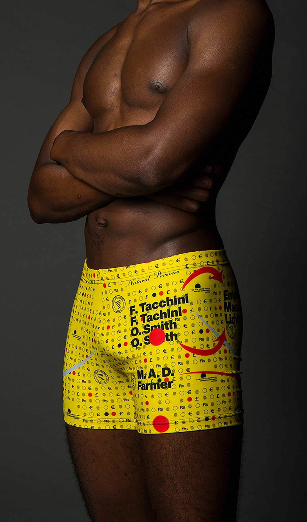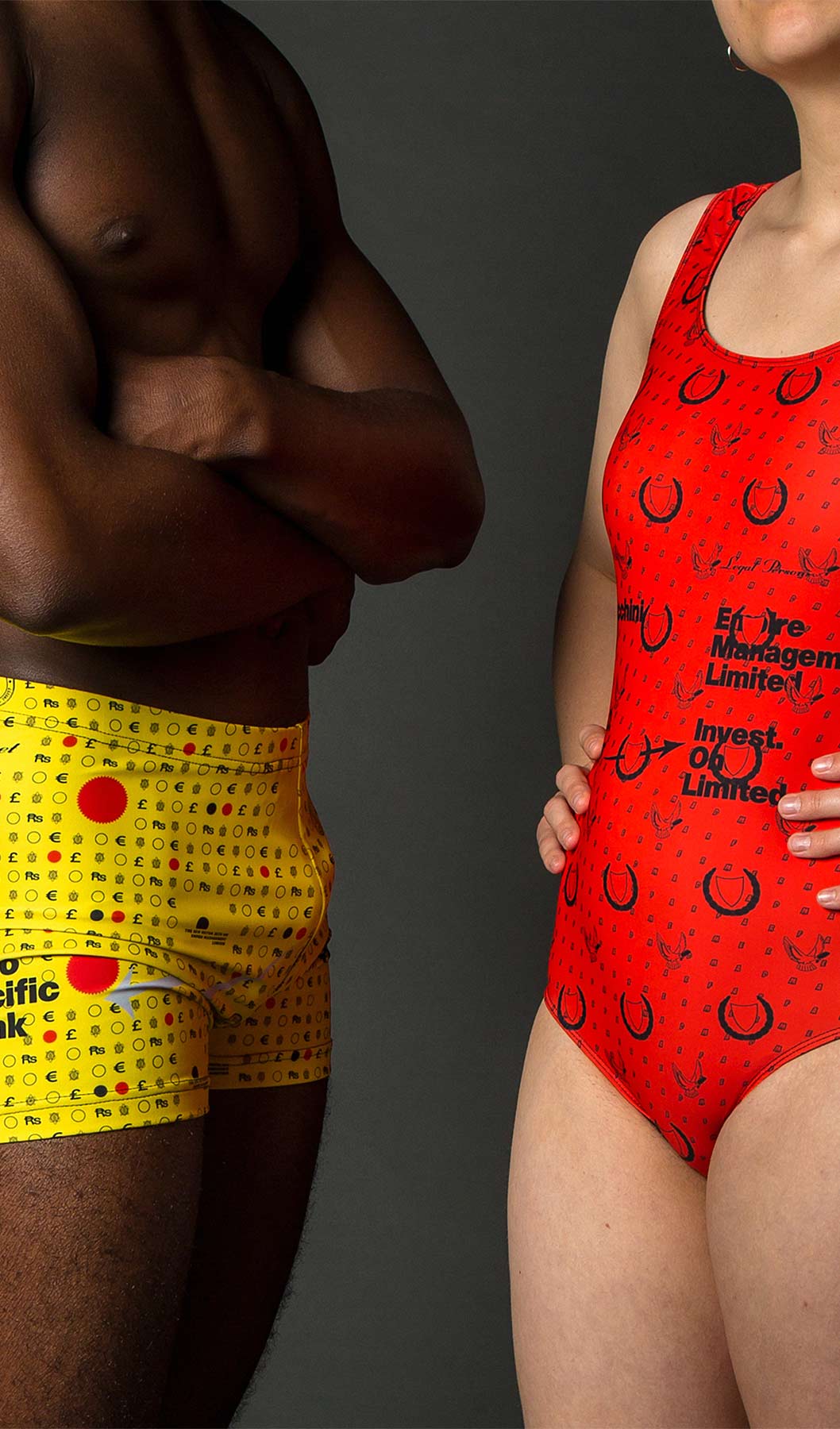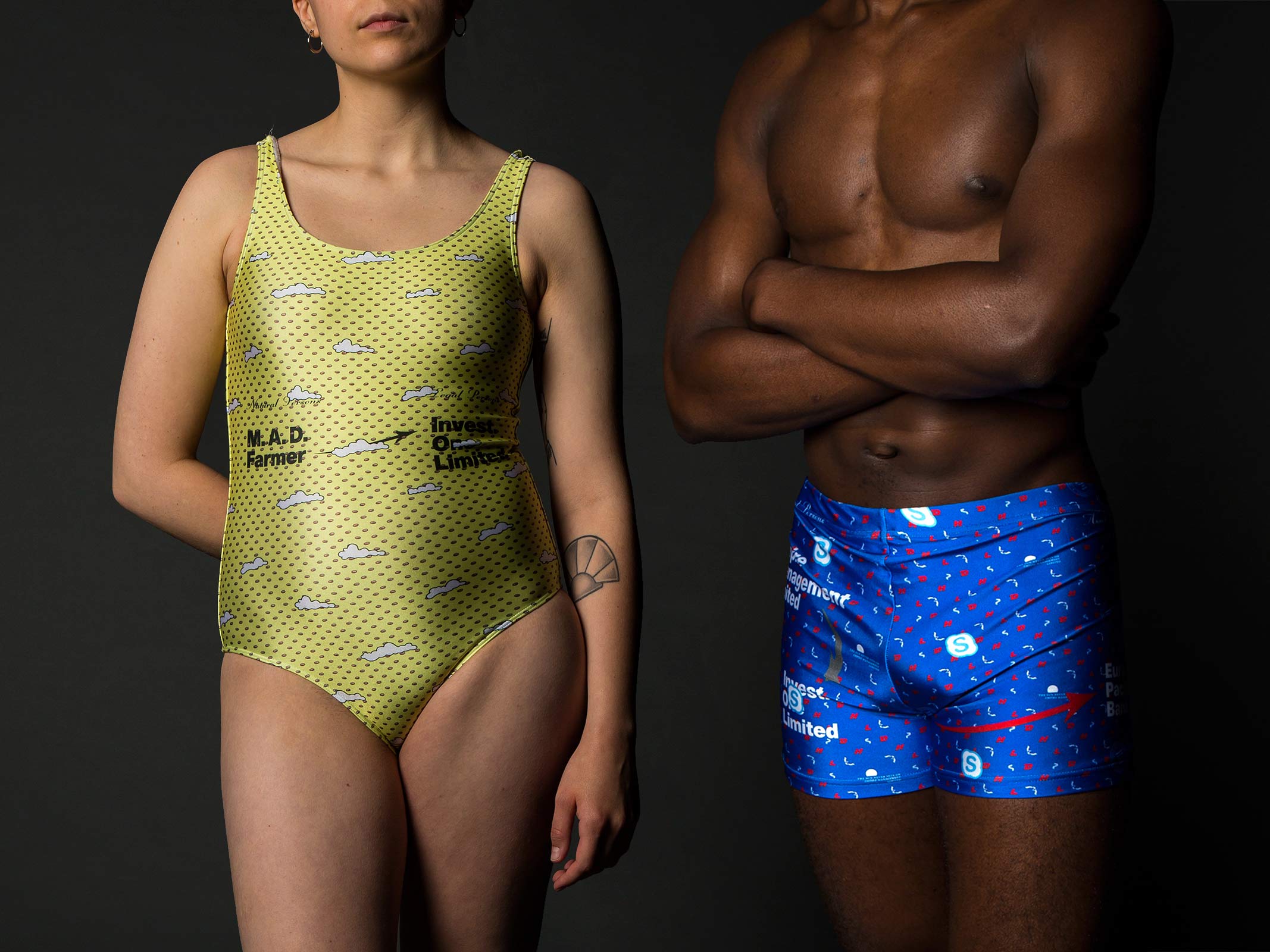 OFFSHORE SS18 is a limited edition beachwear collection sold through an offshore corporate structure set up by dmstfctn. Each purchase through a dedicated online shop activated a functional tax avoidance scheme, moving revenue through the structure to avoid tax. The scheme's details are printed on the apparel as diagrams and patterns. The resulting savings were distributed to members of the public who had invested in the structure during a public performance at transmediale festival in Berlin.