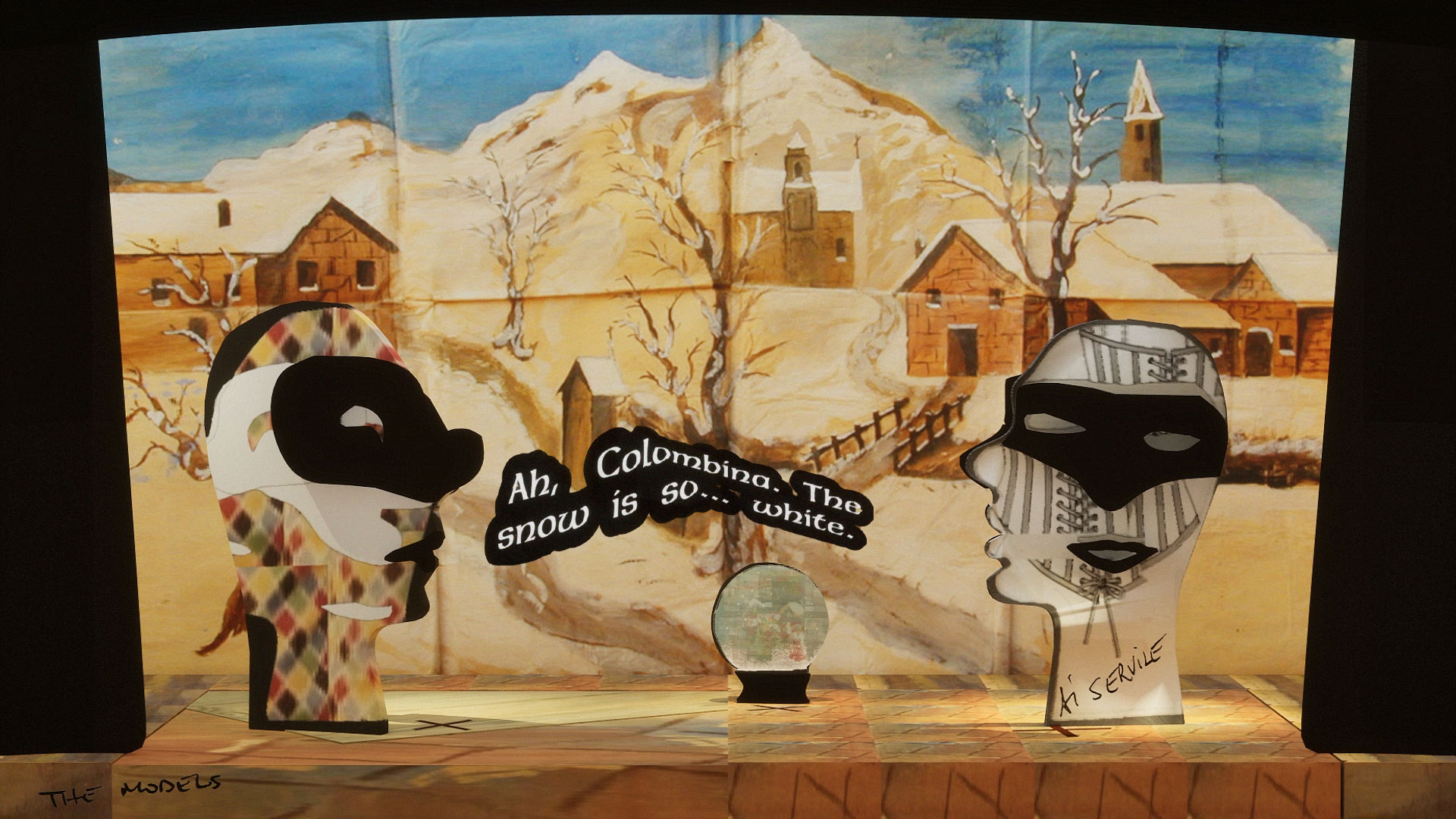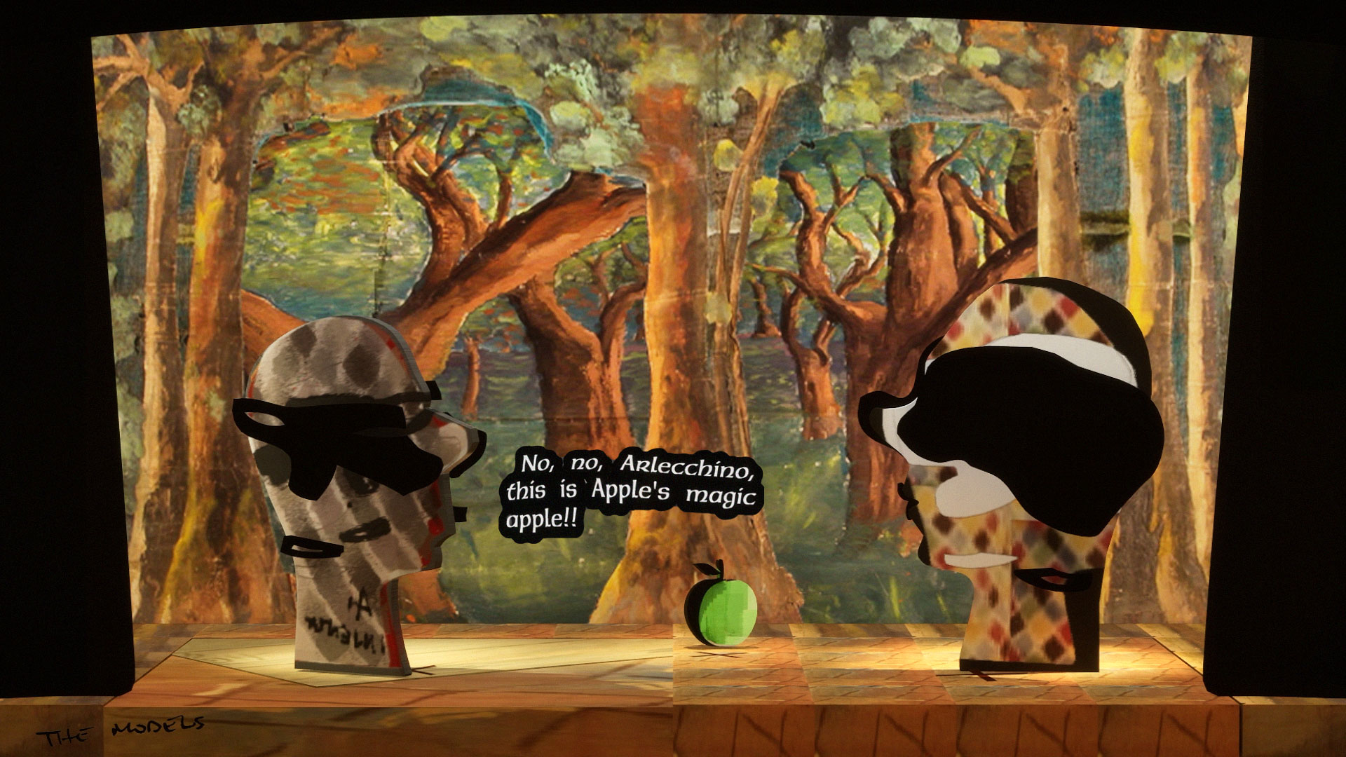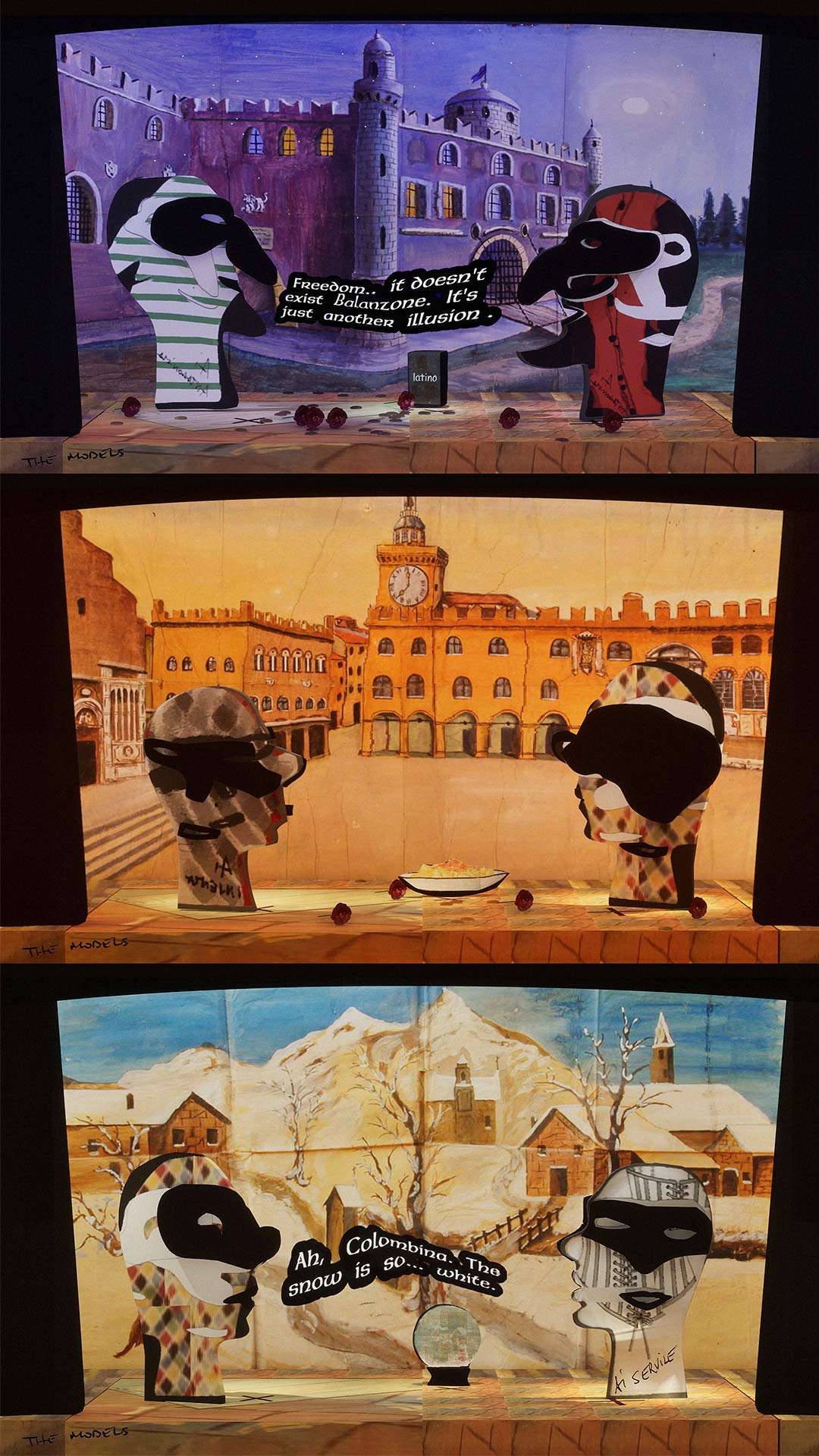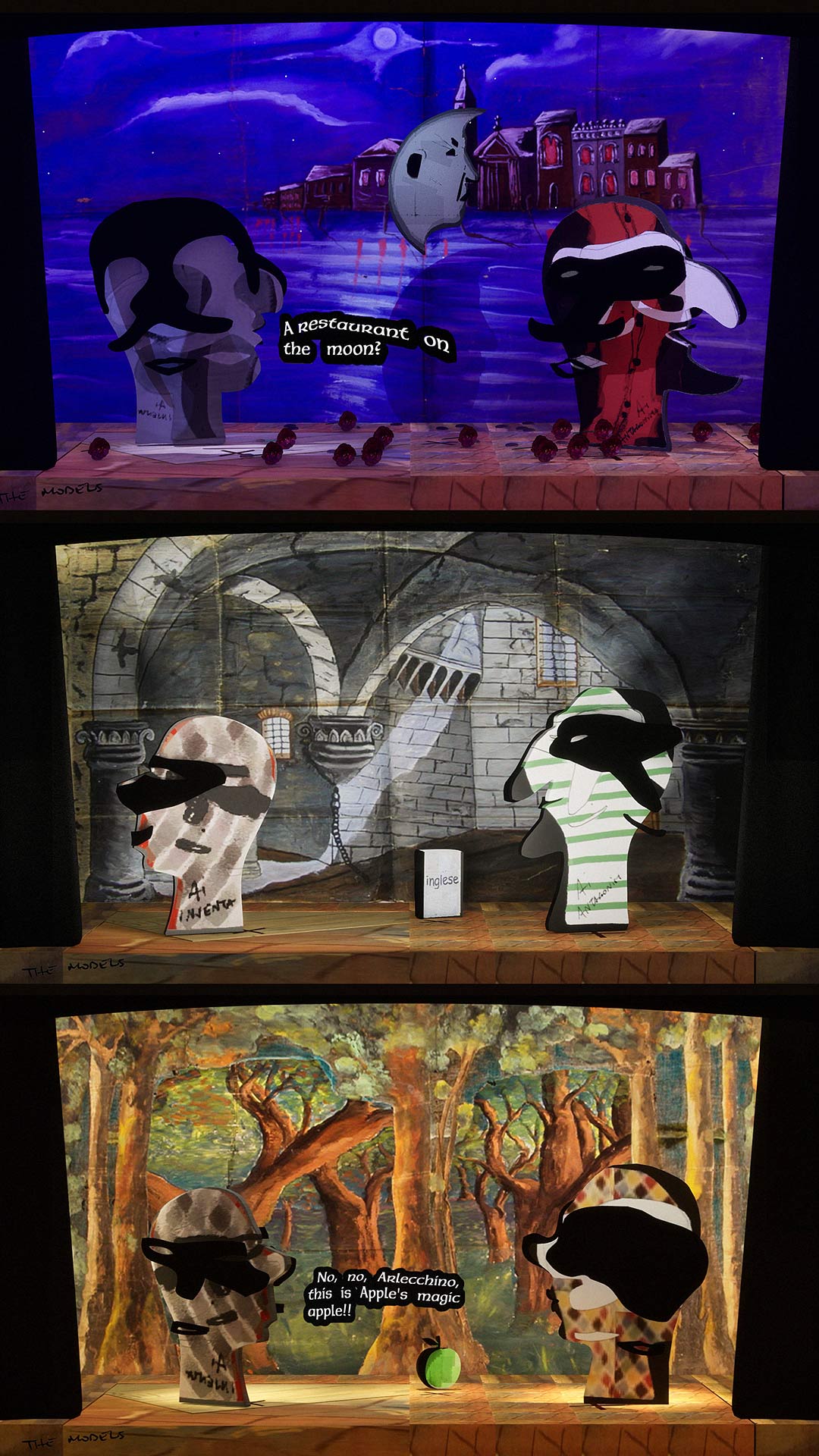 The Models is an interactive installation exploring the improvisational nature of generative AI, and its sometimes nonsensical, sycophantic, or deceptive character. A live simulation running continuously for a year renders theatrical scenes improvised in a style and by a cast inspired by Italian Commedia dell'Arte. Dialogues are generated by a system of AI models prompted to impersonate traditionally servile, lying or antagonistic Commedia masks, such as Arlecchino, and improvising around a set of controversial props that symbolise superstition, folklore, and falsehoods.