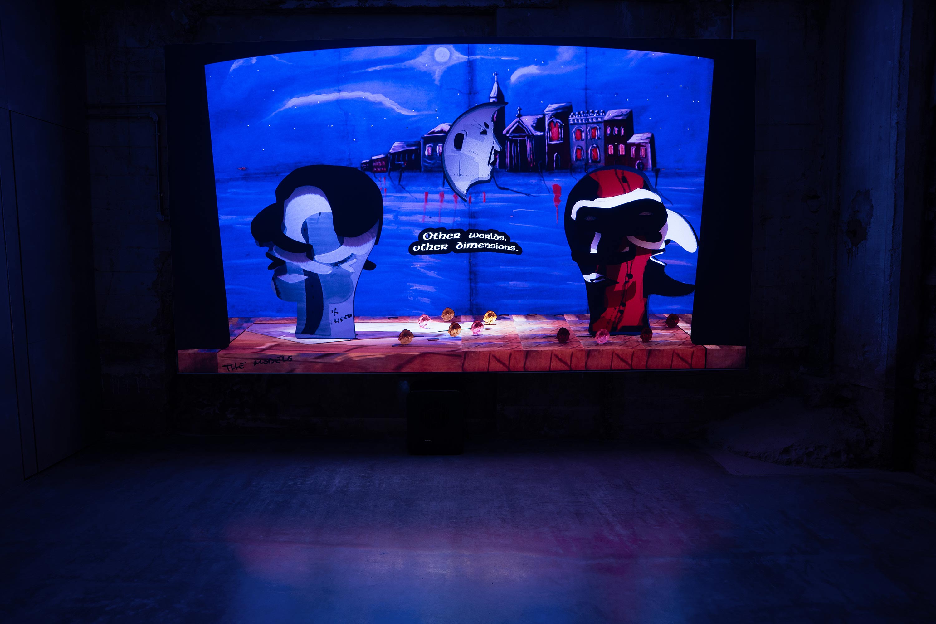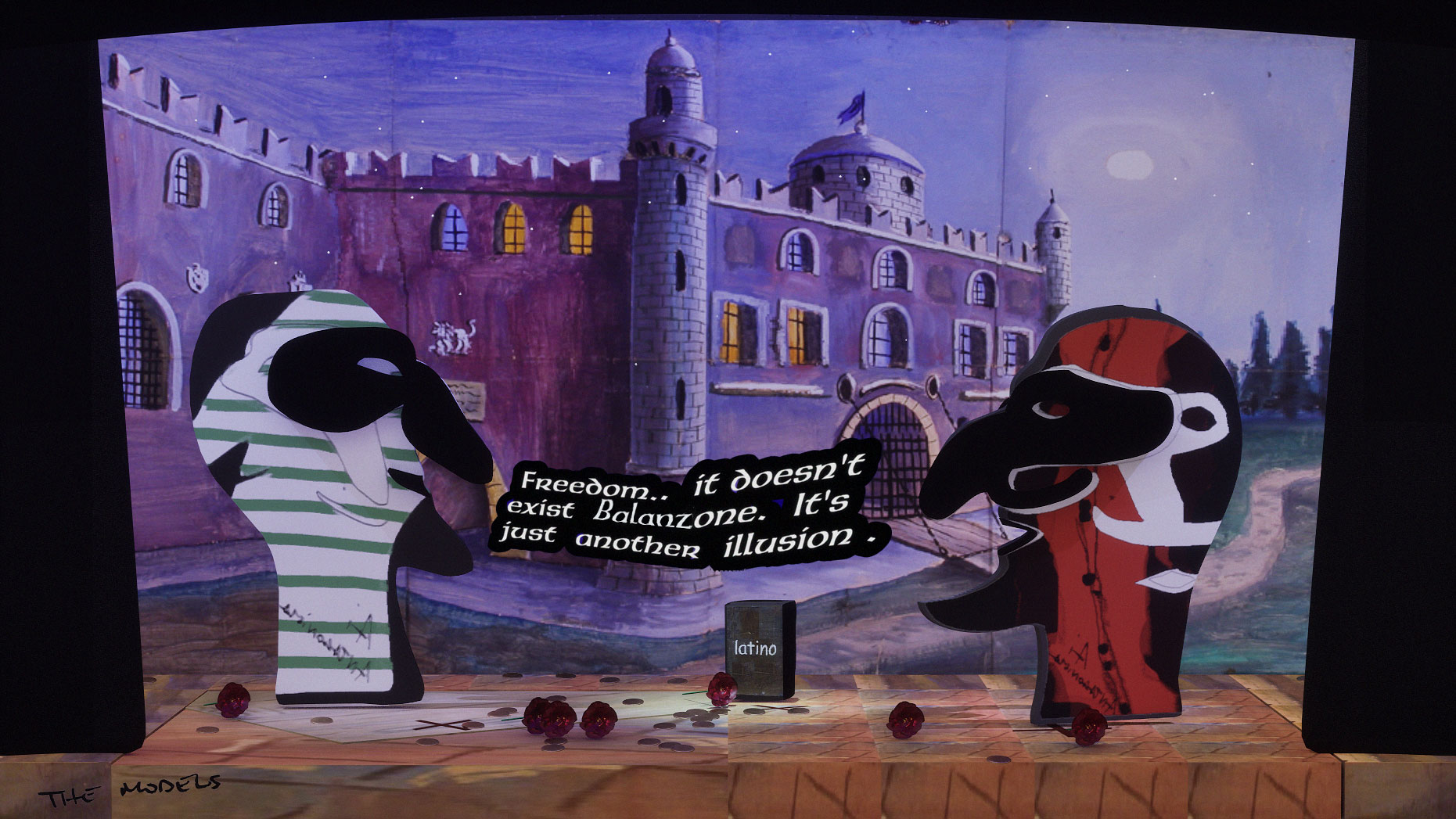 Exhibited: SOLO CSV (Madrid), Adapter (Budapest), Centro de Historias (Zaragoza), Tecnopolo (Bologna)The Models is an interactive installation exploring the improvisational nature of generative AI, and its sometimes nonsensical, sycophantic, or deceptive character. A live simulation running continuously for a year renders theatrical scenes improvised in a style and by a cast inspired by Italian Commedia dell'Arte. Dialogues are generated by a system of AI models prompted to impersonate traditionally servile, lying or antagonistic Commedia masks, such as Arlecchino, and improvising around a set of controversial props that symbolise superstition, folklore, and falsehoods.